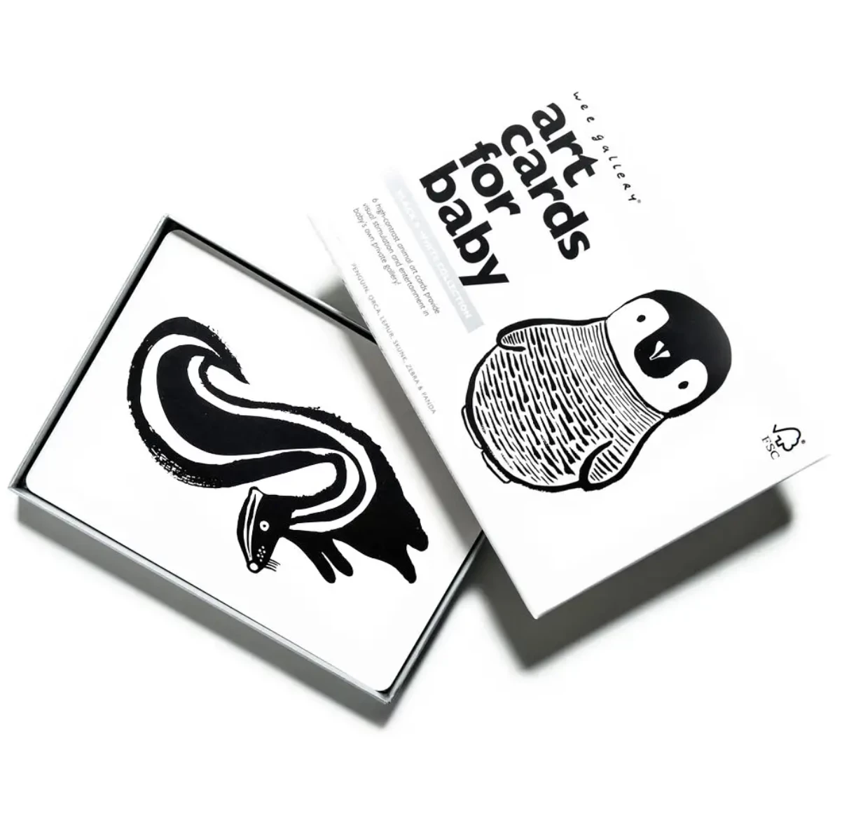Black and white art cards for baby. Babies are fascinated with black-and-white designs. The six adorable animals in this set include a penguin, orca, lemur, skunk, panda, and zebra. Each 5″ x 7″ card is beautifully finished with matte lamination and child-friendly rounded corners.