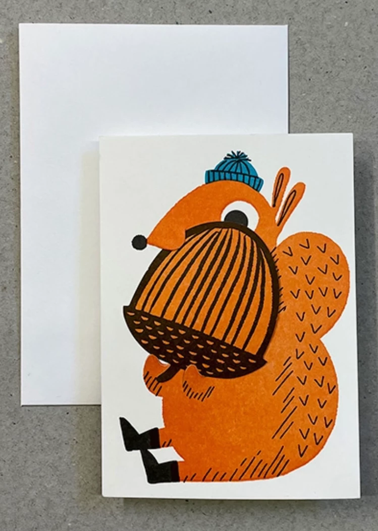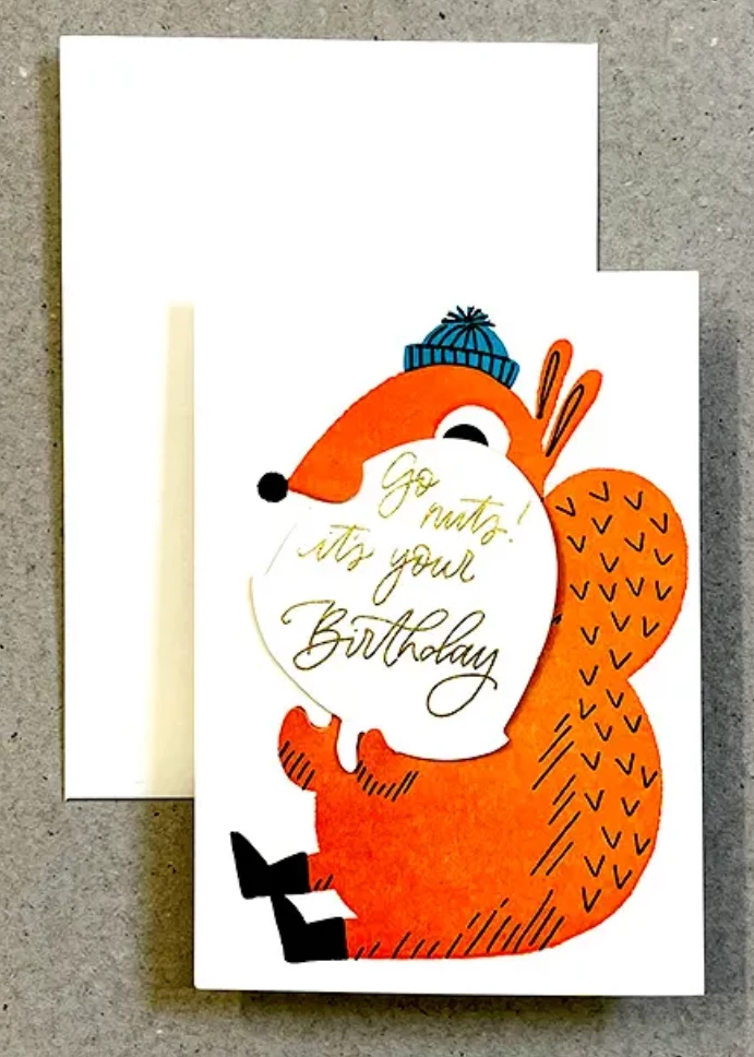 This delightful illustrated card is letterpress printed and then die cut, a secret squirrel is clinging onto his favourite nut, if you turn it around a secret message can be found in super luxe hot foil…SECRET MESSAGE READS – ‘Go nuts it’s your Birthday!’